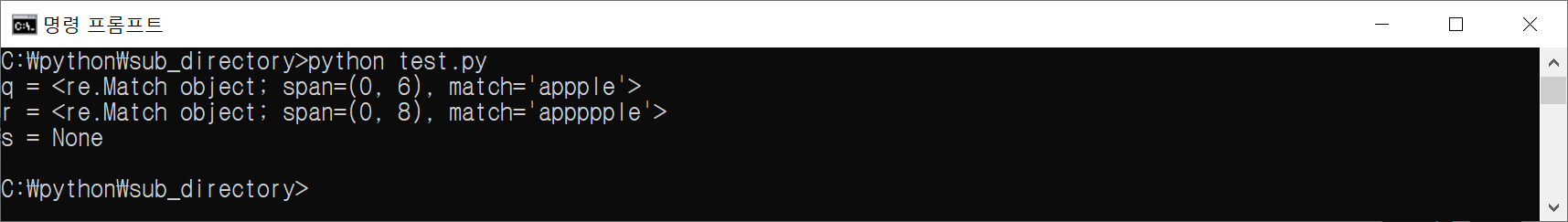 q = re.search(r'ap{3,5}le', 'appple') # p 3번 반복
