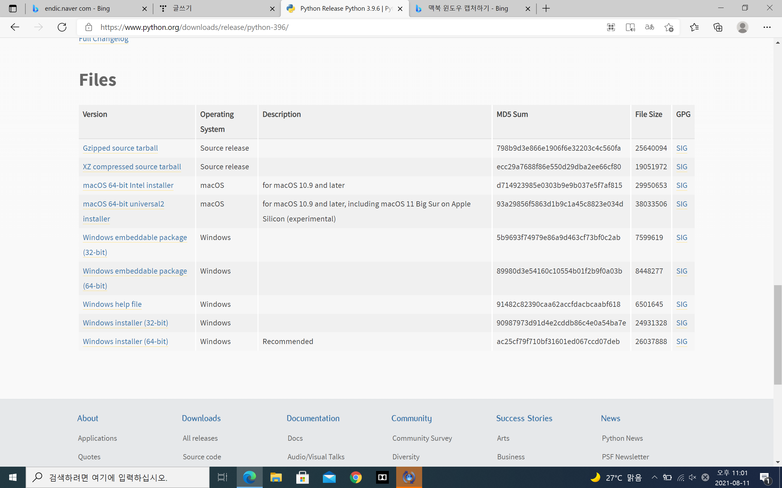 2. 최신버전은 버그가 존재할 수 있으니, 배우는 입장에서는 stable releases를 다운 받도록 한다. ( python 3.9.6 )