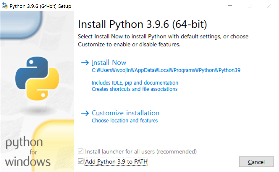 4. 다운받은 파일 실행 및 "Add Python 3.9 to PATH"를 선택하고 "Install Now"로 설치