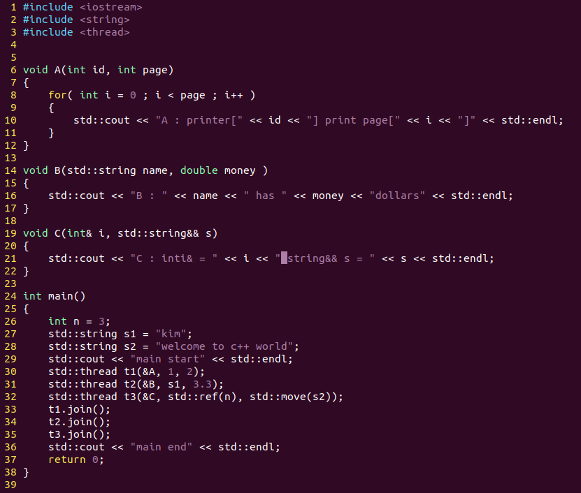 int& (L-value) 와 string&&(R-value) 형을 인자로 가지는 C thread