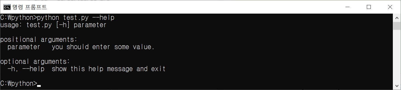 add_argument()의 2번째 인자인 "help"는 script 실행 시 --help 옵션과 함께 실행하면, 아래와 같이 간단한 guide를 출력해 줄 수 있다.