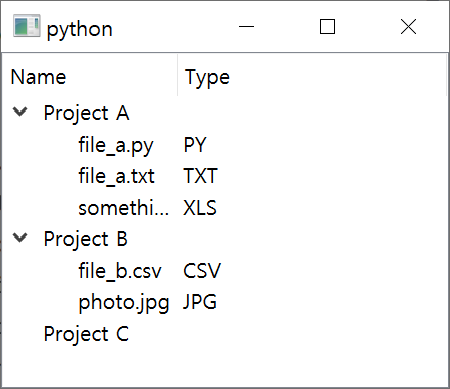 tree.setHeaderLabels(["Name", "Type"]) # column의 label을 설정함