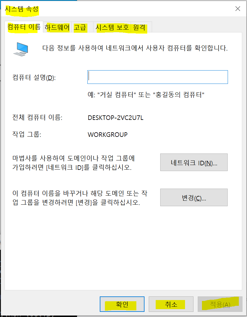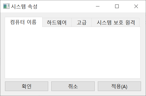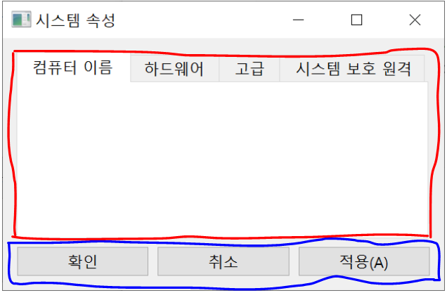 TabWidget을 사용한 "내 PC -> 설정 -> 고급 시스템 설정" 화면도 아래와 같이 Tab Widget을 사용하여 여러 정보를 표시하였다.