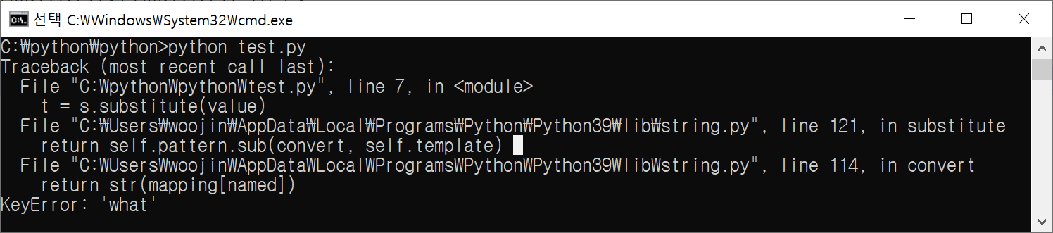 다음과 같은 Error 상황이 발생하면 안되지만, 이러한 Error 발생을 막기 위해 safe_substitute() 를 사용하기도 한다.