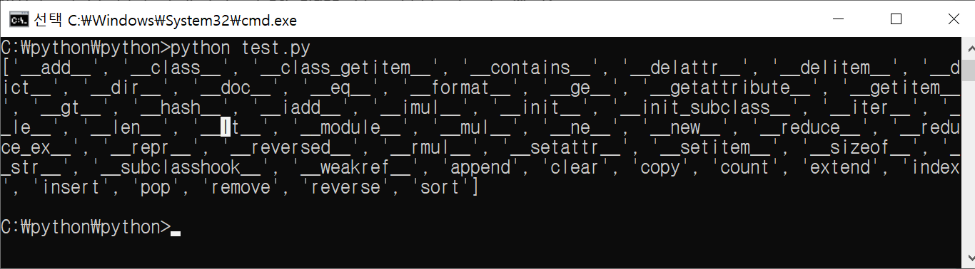list 클래스를 상속받은 Func class의 객체를 사용하여 dir() 를 수행하면, 아래와 같이 str class와는 다름을 알 수 있다.
