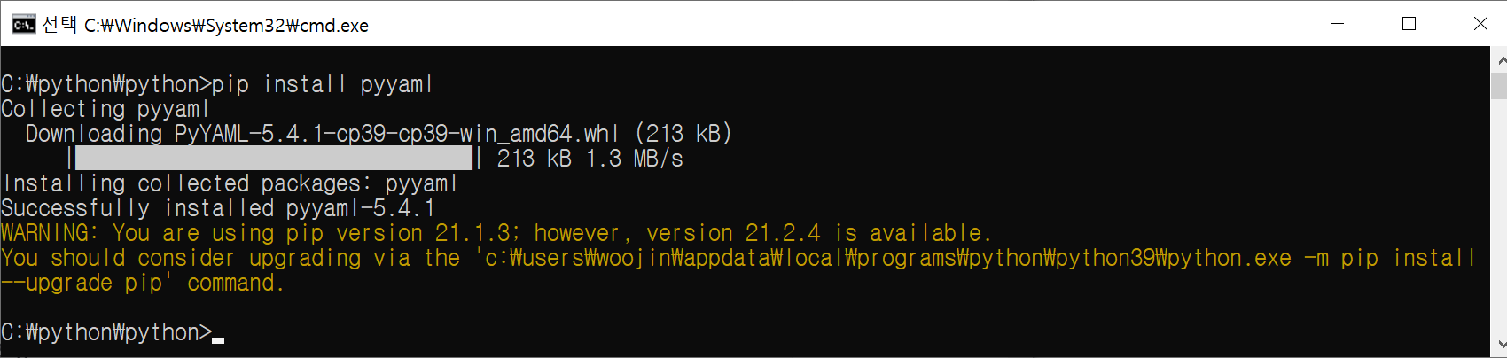 python에서 yaml 파일을 다루기 위해서는 아리 명령을 통해 pyyaml 을 설치해야한다.
