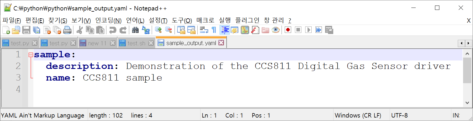 위 예제는 sample.yaml 파일을 읽어들여 출력하고, predefined_data 에 저장된 값을 sample_output.yaml 파일에 write하는 코드이다.