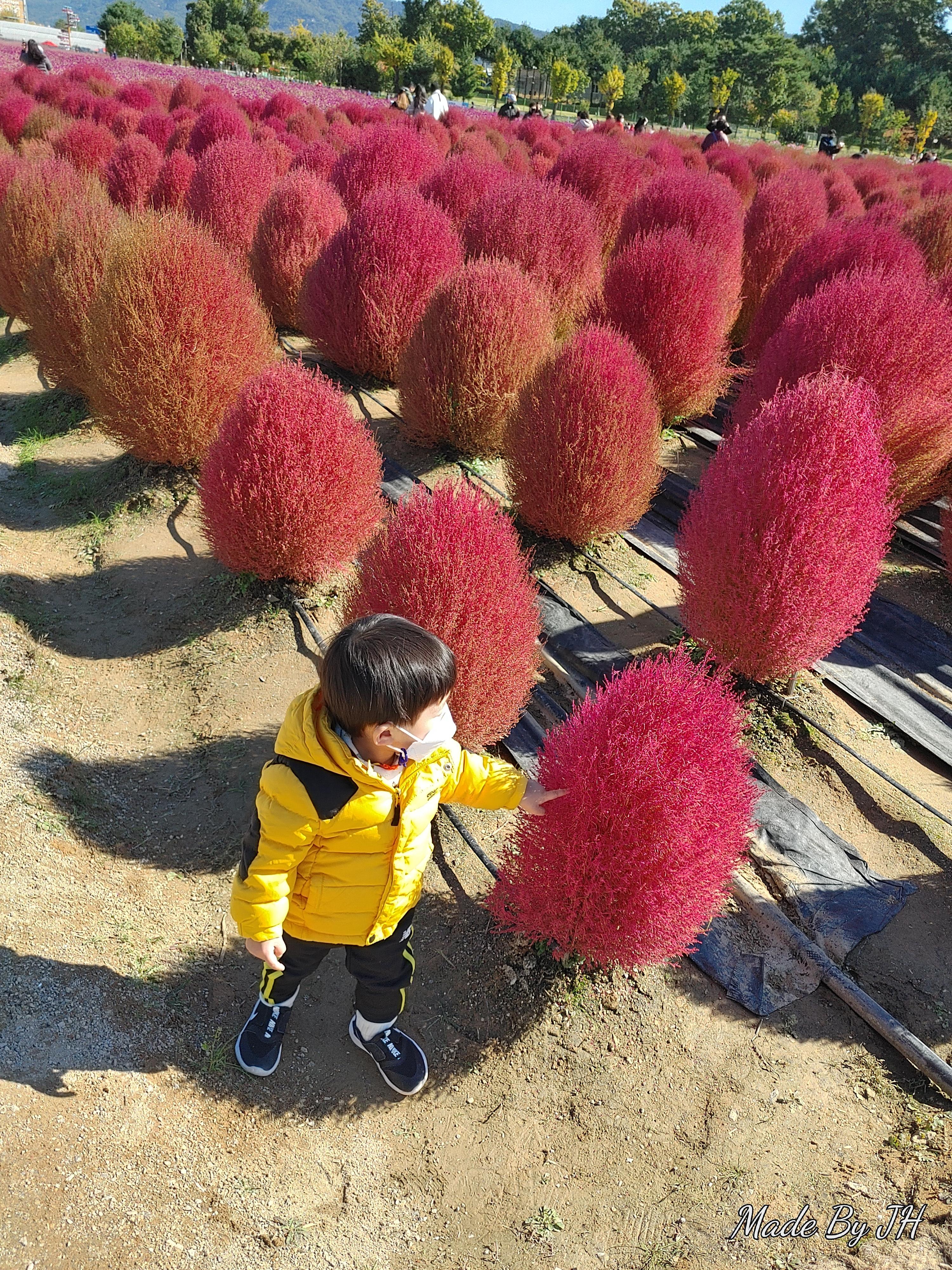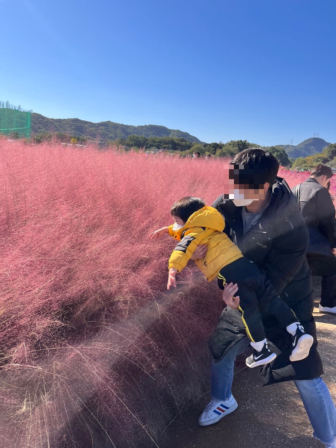 푸른 하늘과 붉은 핑크뮬리와 아들이 참 잘 어울린다.