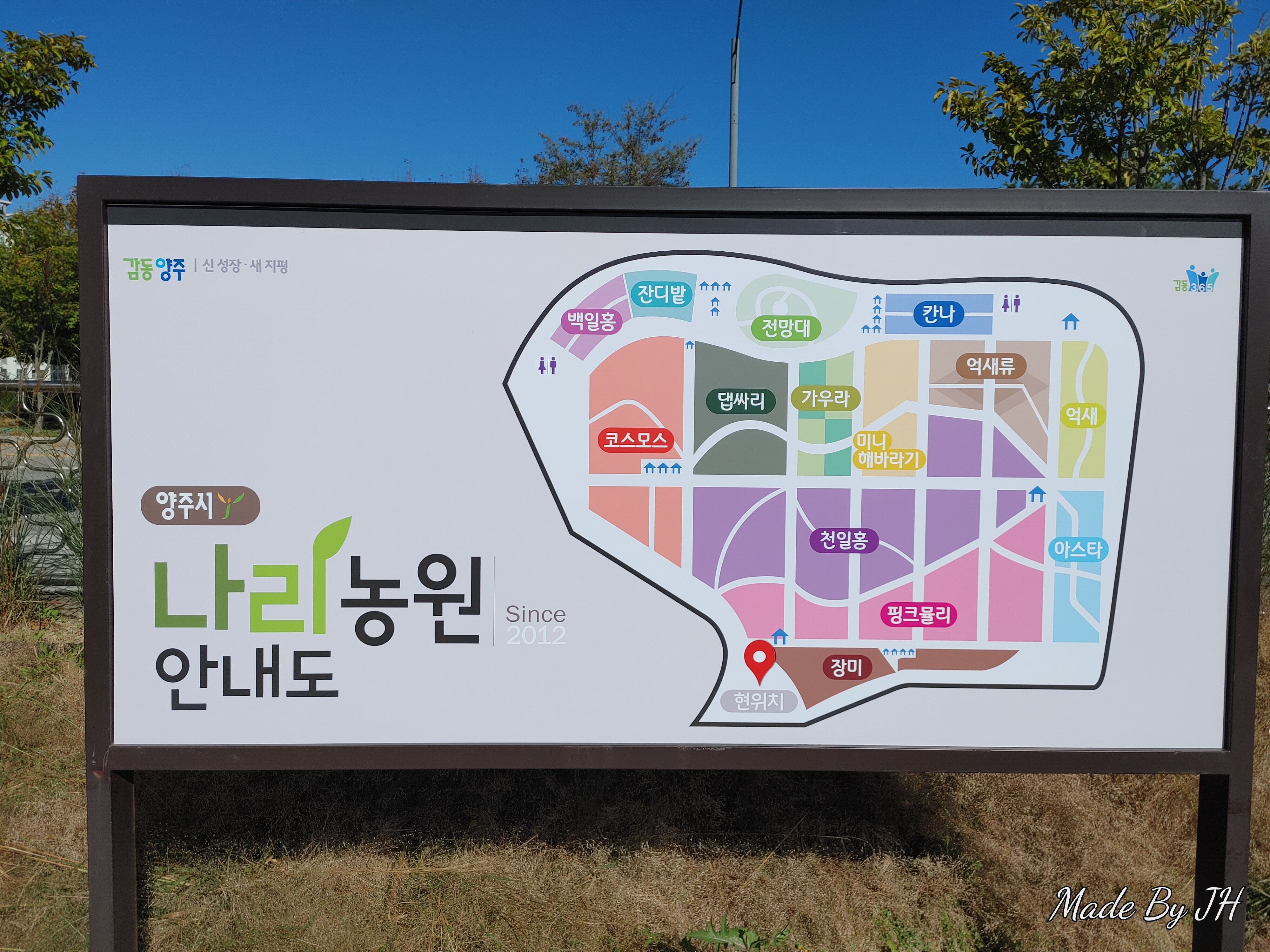 나리 공원 안내도로 저넣게 구역이 나뉘어져 다양한꽃들이 심어져 있었다.
