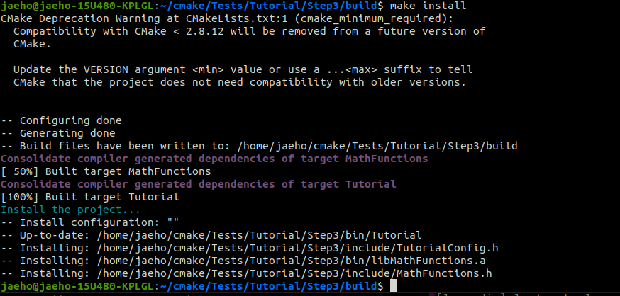 make install 명령을 통해 CMakeLists.txt 에 선언한 install() 함수를 실행해보자.